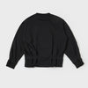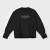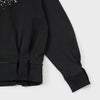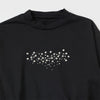 コットン100%の裏毛を使用し、プリントを施し、その後ビジューを熱圧着させたデザイン。スタッズビジューとパールビジューをミックスさせ今シーズンテーマである【Mixed Emotions】を表現したプロダクト。裾と袖にはタックを入れ、スウェットではあまり見られない手法を取り入れています。